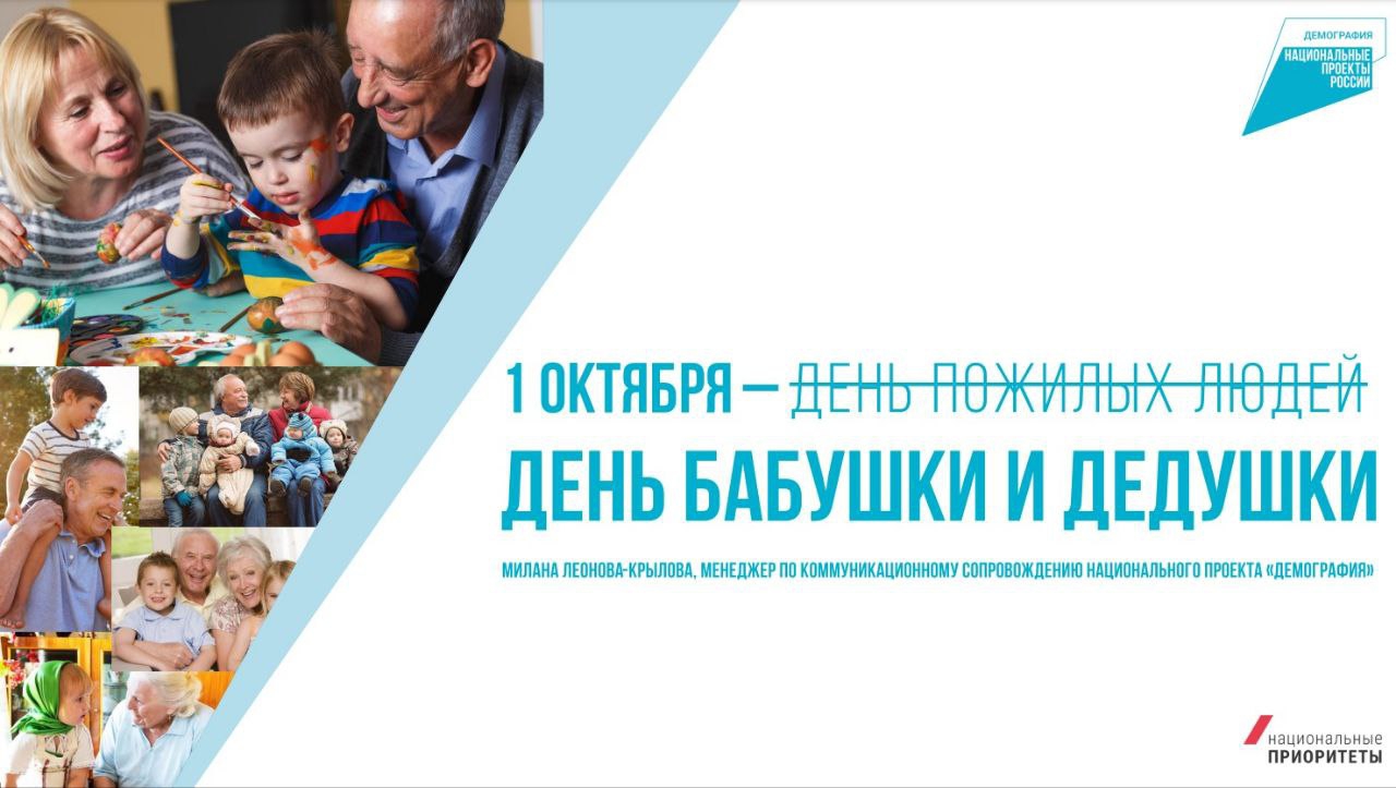 1 октября в России впервые отпразднуют «День бабушки и дедушки» 1 октября в Международный день пожилого человека в России впервые проведут акцию «День бабушки и дедушки», при поддержке национального проекта «Демография». У нас не всегда получается достаточно часто видеться с нашими старшими родственниками. Хотя это общение крайне важно для всех поколений. По мнению специалистов, позитивные эмоции от общения с детьми помогают значительно улучшить ментальное здоровье и продлить жизнь людей старшего возраста. А детям любовь и забота старших родственников помогают гармонично развиваться и расти. Сделайте этот день теплее, проведите его со своими бабушками и дедушками, а если они далеко – позвоните и поздравьте с праздником! В рамках акции «День бабушки и дедушки» по всей стране пройдут праздничные мероприятия. Их смогут посетить все желающие – люди старшего возраста, дети и их родители. Мероприятия пройдут в общественных пространствах городов, в Центрах социального обслуживания населения, Центрах долголетия и культурных организациях. Участники акции «День бабушки и дедушки» смогут посетить концерты коллективов людей старшего возраста, посоревноваться в спортивных мероприятиях, научиться новому в творческих мастер-классах и многое другое