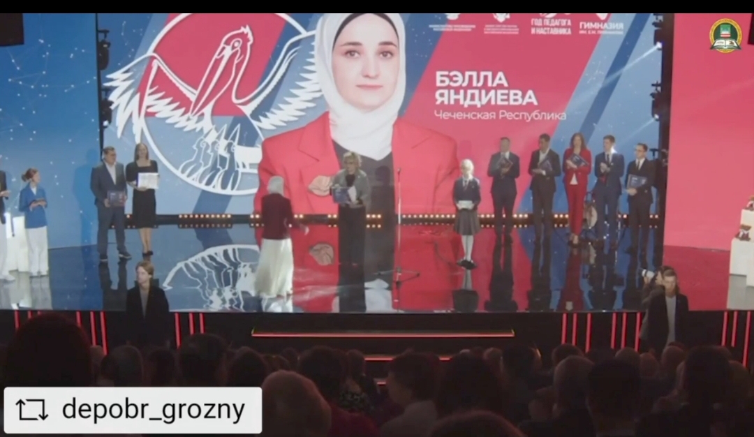 Торжественная церемония награждения и объявления 15 лауреатов, набравших наибольшее количество баллов, прошла в Гимназии им. Е.М. Примакова. Среди них - Яндиева Бэлла Башировна, учитель английского языка МБОУ «СОШ № 7» города Грозного, которая стала одной из претенденток на звание лучшего учителя России текущего года.