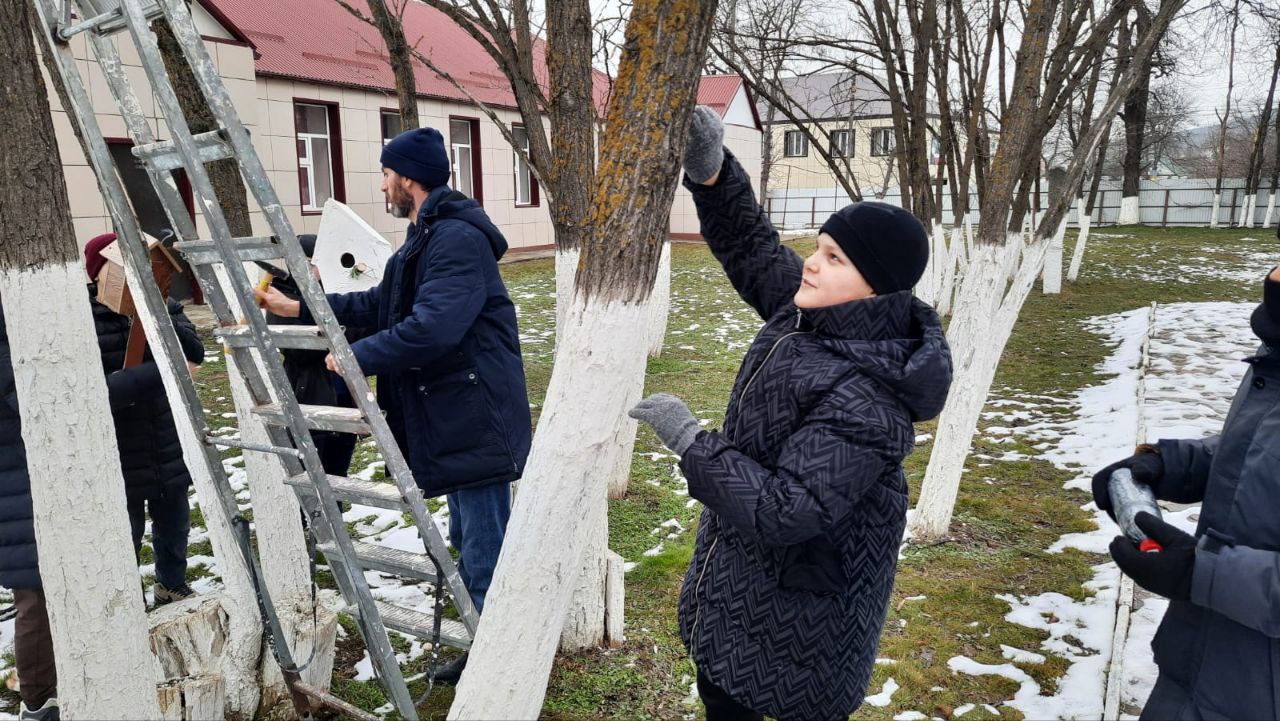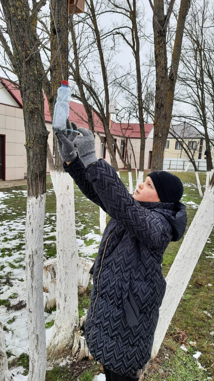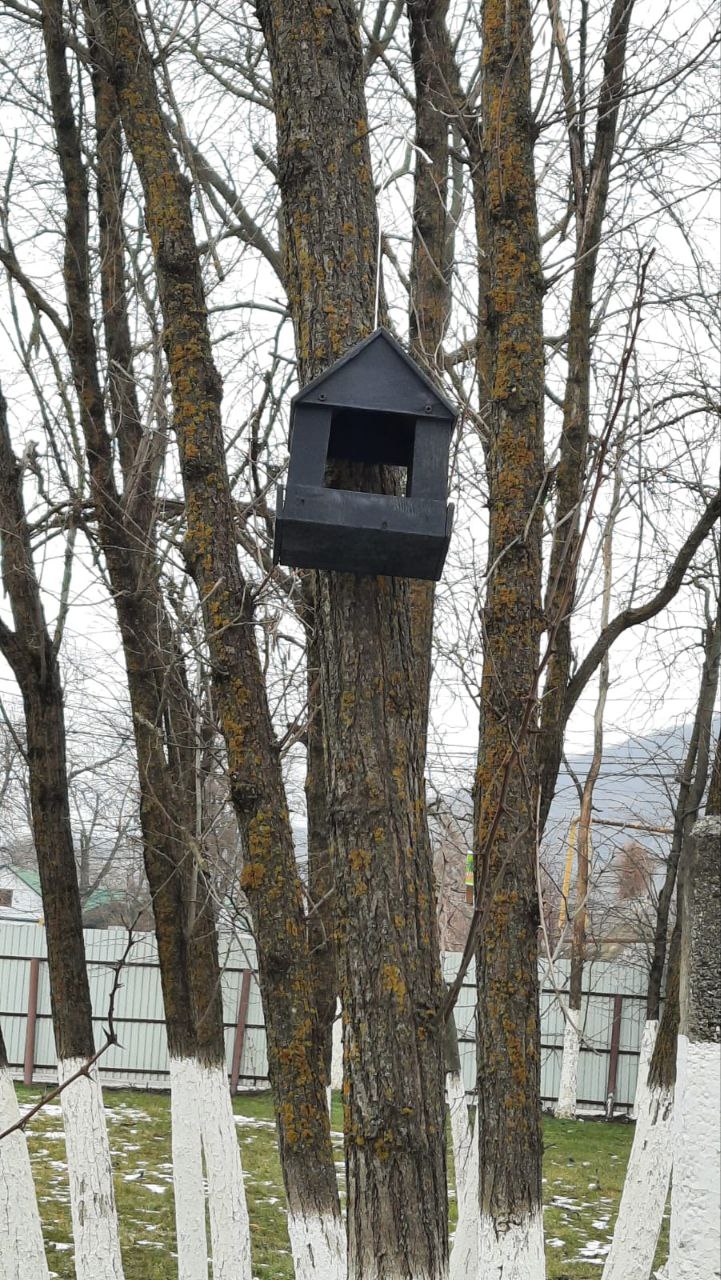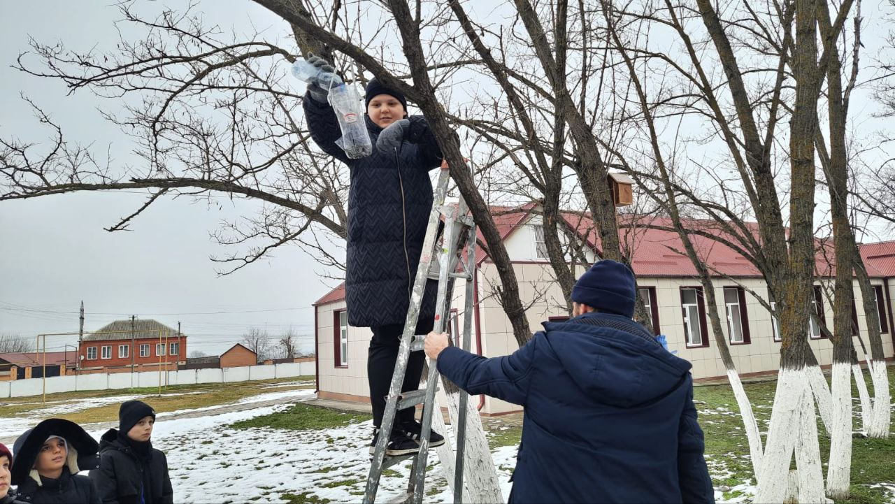 Дети при содействии учителя технологии Муртазова Магомеда Алиевича развесили кормушки, изготовленные из подручного материала, и наполнили их кормом.