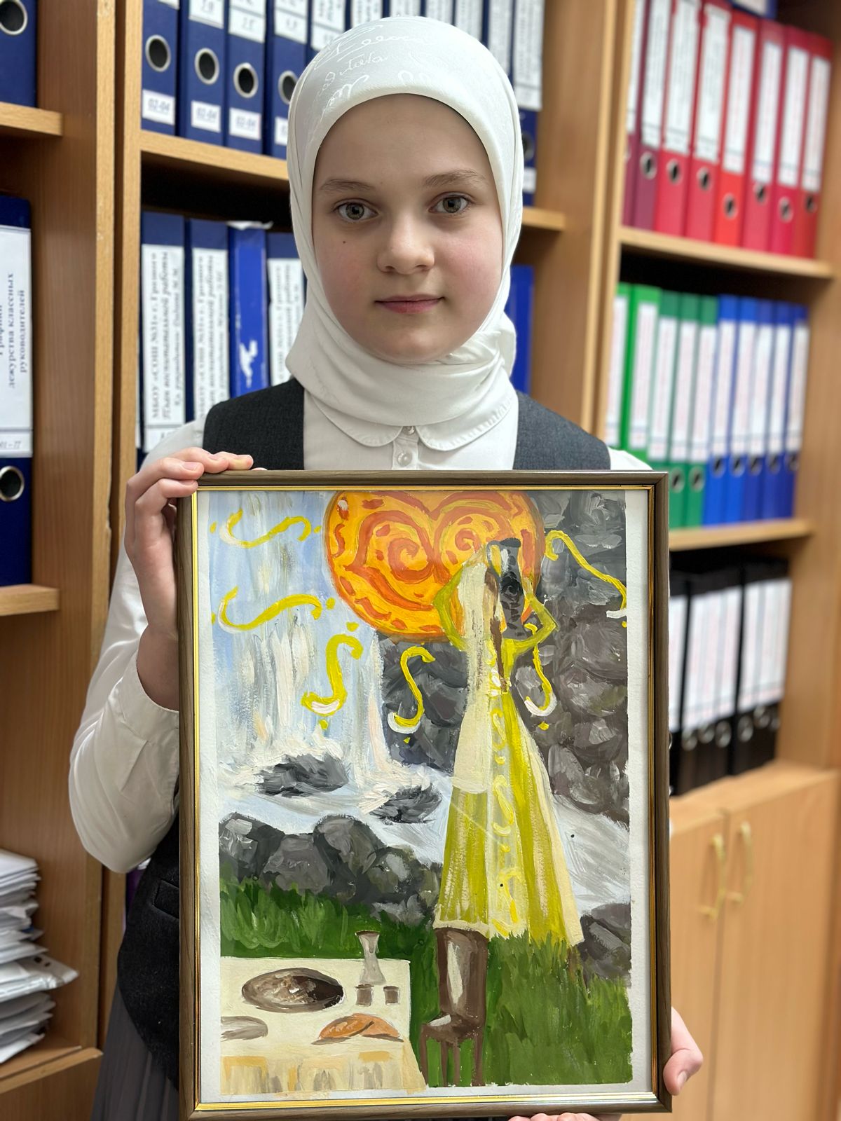 Далилова Линара, ученица 8 «а» класса, сказала: «Я участвую в подобном конкурсе во второй раз и уверена в своей победе. Нарисовала пейзаж, связанный с началом нового дня, связав сюжет с национальным колоритом».