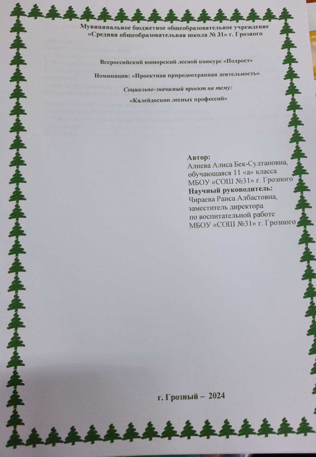 Объектами исследования Алиевой Алисы явились лесные профессии, востребованные на территории Чеченской Республики, необходимые условия и знания, чтобы выбрать одну из лесных профессий.