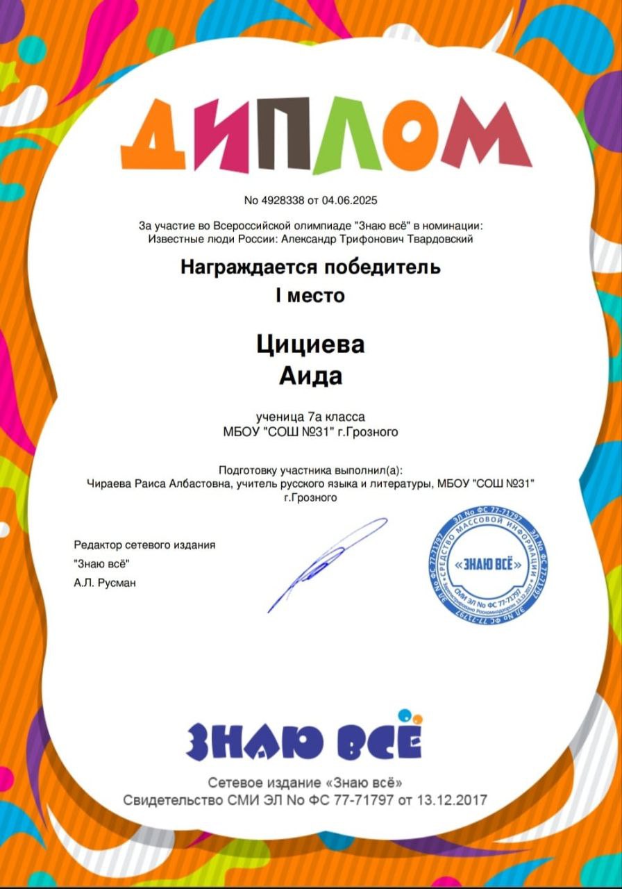 Обучающаяся 7 «а» класса средней школы № 31 г. Грозного Цициева Аида заняла первое место во Всероссийской олимпиаде «Знаю все».